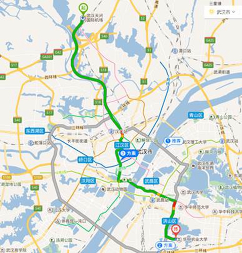 3. 武汉火车站到会议地点打车路线:约1 h,23.1 km,65元(二环线);约45 min,32.7 km,90元(三环线)。